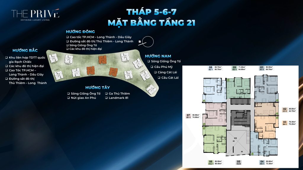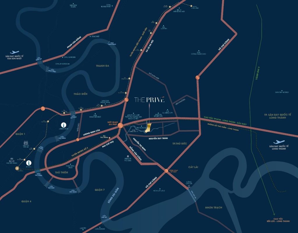 Vị trí dự án The Privé tọa lạc tại vị trí đắc địa trung tâm An Phú, Quận 2. Vị trí sở hữu mặt tiền đường Song hành cao tốc Long Thành – Dầu Giây, với 3 mặt hướng sông trải dài như một biểu tượng của phong cách sống đẳng cấp mới tại khu Đông Sài Gòn. Cư dân The Privé sẽ dễ dàng kết nối ngay đến khu đô thị Thủ Thiêm, trung tâm Q.1 chỉ trong vòng 5-10 phút bằng đường bộ, Metro và đường thủy. Tọa lạc tại vị trí chiến lược, nơi giao thoa của những tuyến đường huyết mạch, The Prive không chỉ là chốn an cư mà còn được xem như là “trạm kết nối tương lai”, nơi mọi tuyến đường hội tụ, mọi tiện ích đều trong tầm tay.