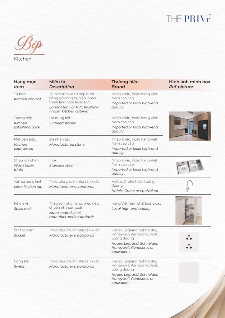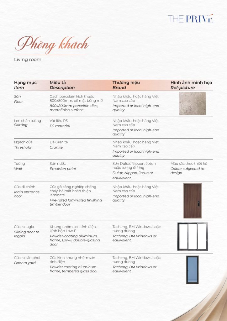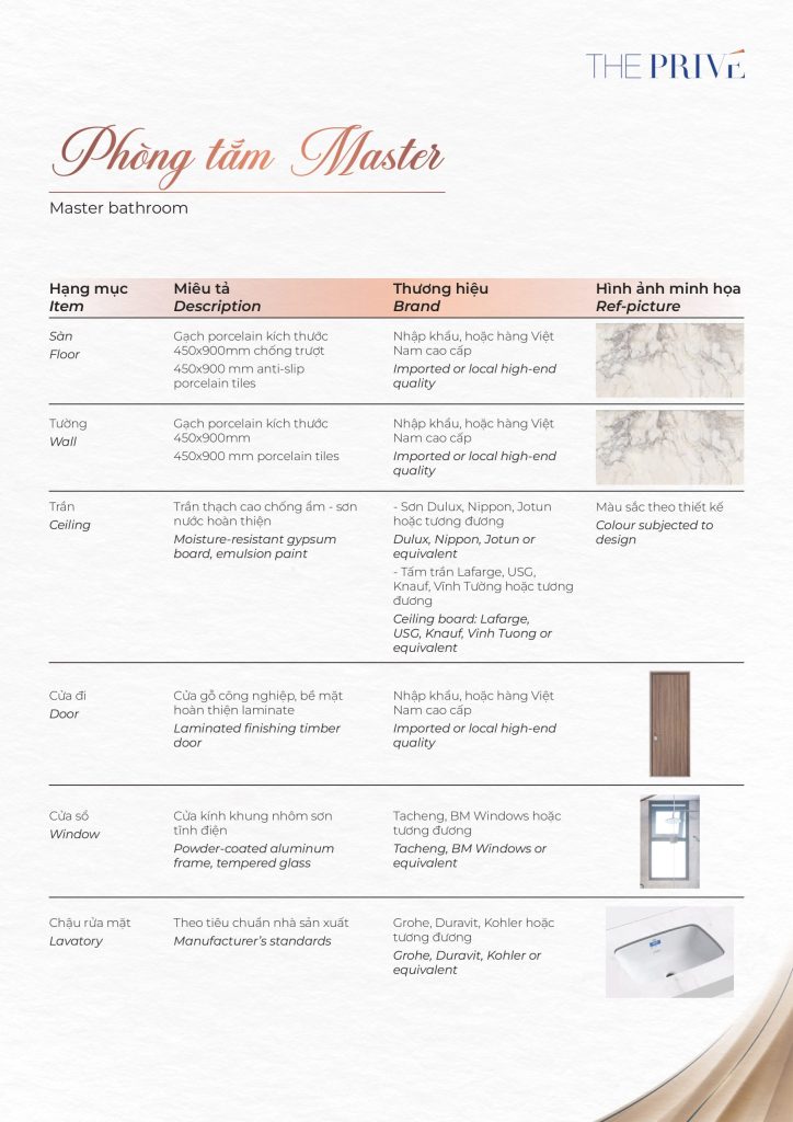| Nội thất | Hoàn thiện cơ bản – nội thất cao cấp như : Kohler (Hoa Kỳ), Duravit (Đức), Bosch (Đức), Brandt (Pháp), Schindler (Thụy Sỹ), Otis (Hoa Kỳ), Kone (Phần Lan), Comelit (Ý), Jotun |